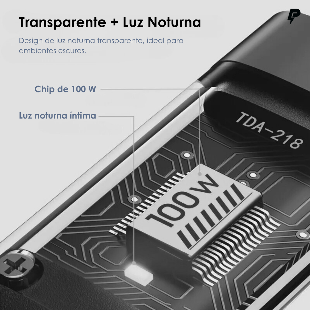 Com capacidade de carga rápida de até 100W, você economiza tempo e energia, garantindo que seus dispositivos estejam sempre prontos para uso.