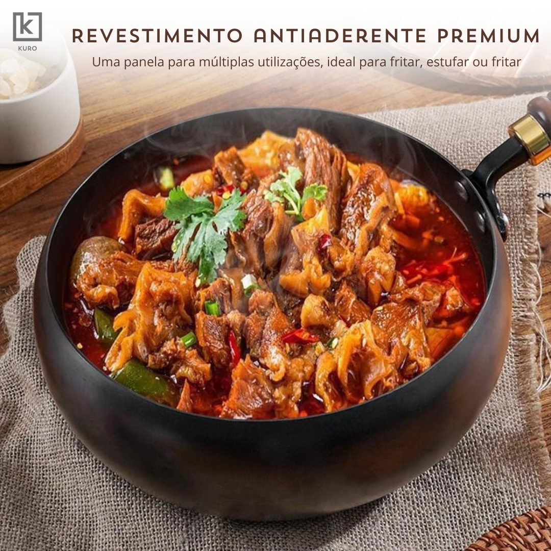 O cabo de madeira projetado ergonomicamente oferece um manuseio confortável e seguro, mantendo suas mãos longe do calor. Cozinhe com confiança e estilo.